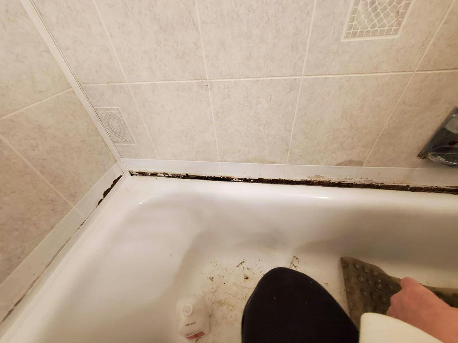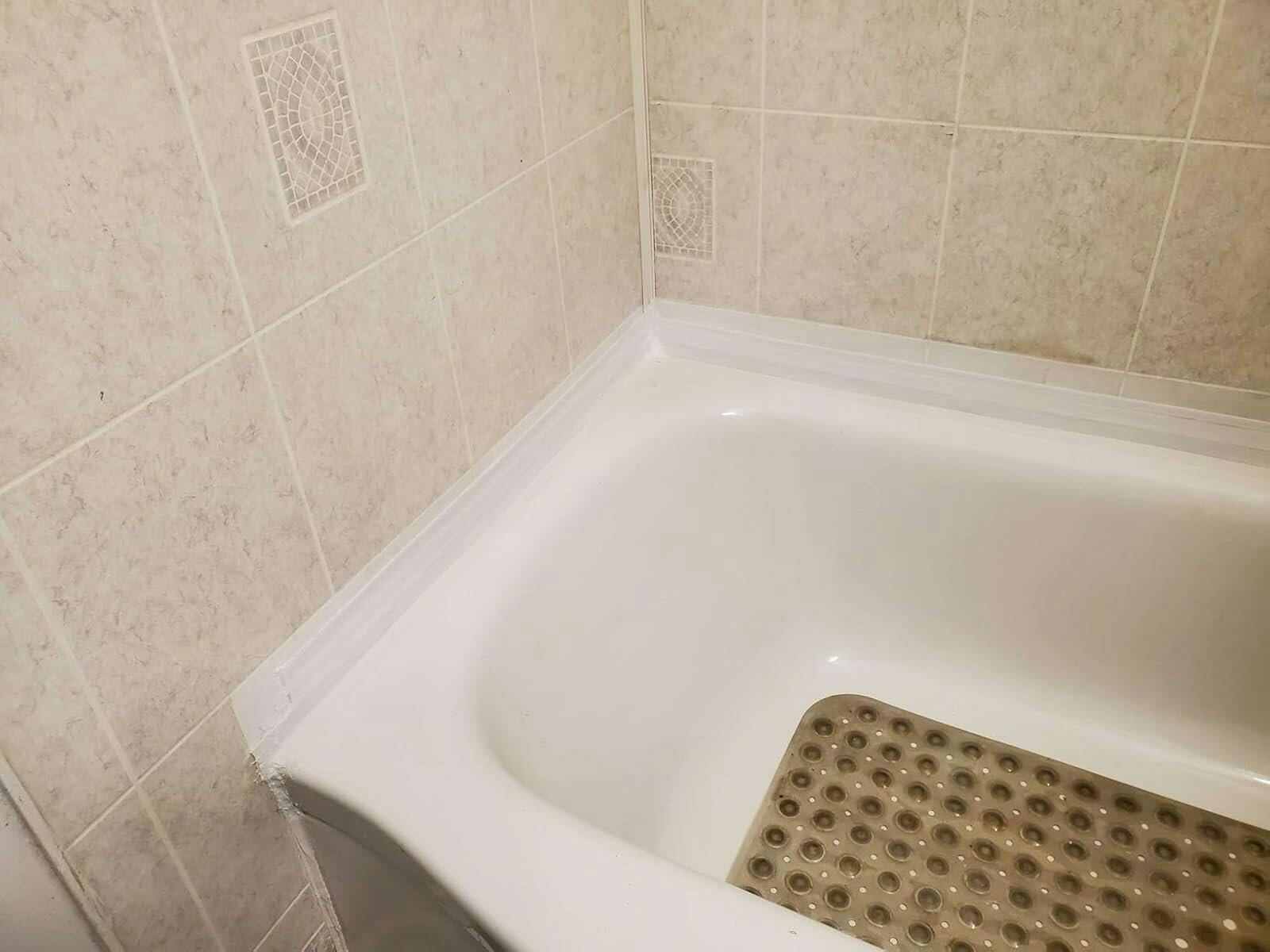 Necesitaba un parche rápido para la bañera hasta que pueda reparar la pared de una fuga pasada. Fue muy fácil de usar y ha funcionado muy bien hasta ahora. Me aseguré de limpiar muy bien el área alrededor de la bañera, raspé cualquier adhesivo viejo y tiza. Hay daños por agua en la pared detrás de la bañera, así que dejé que todo se seque unos días antes de sellarla. Después de limpiar el área, medí y corté la tira a la medida, y fue muy fácil de aplicar. Tiene una textura y un grosor agradables. Se ve muy limpia y blanca. El material es como una cinta adhesiva gruesa, flexible y gomosa, y debería durar bastante. Después de adherirla, usé un secador de pelo a baja temperatura y repasé todo para asegurarme de que estuviera bien pegado a la pared. Usé dos capas: una en el borde y luego una tira encima para que cubriera más la pared. La primera imagen muestra una capa, la segunda, dos capas y el resultado final.